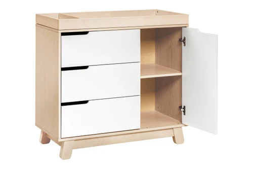 Get more from your nursery furniture with the versatile Hudson Changer Dresser. Combining a changing table, three drawer dresser, and storage cabinet all in one solid and practical package, the Hudson Changer Dresser is a modern space-saving convenience. Complementing the mid-century modern-inspired Hudson 3-in-1 Convertible Crib, the dresser comes in three chic finishes including two new takes on two-tone for the nursery. Truly built for baby, the removable changer tray’s raised sides help keep your little one safe, and an anti-tip kit is included for further security. Keep baby’s clothes and necessities organized in the smooth-opening drawers, while stop mechanisms prevent them from being pulled all of the way out. The storage cabinet closes gently and includes an adjustable shelf, perfect for keeping diapers and wipes handy.