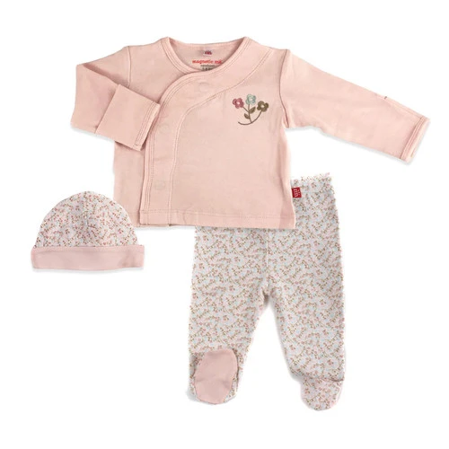 Our time-saving magnetic fasteners and no over-the-head design gets baby dressed quickly while significantly reducing their exposure to the chilly air. Great for new moms and dads during night changings top stays closed during diaper changes and keeps baby warm. Flat elastic waist helps you slip on and off for a quick diaper change. Mitten cuff with fold-over detail to keep baby from scratching itself. This newborn essential is fabulous for brand new babies (in the hospital) and for baby’s first trip home. Comes with matching hat.
