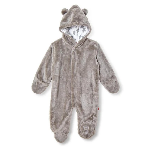 Our little bear suit features our hidden magnetic closures and gets baby ready for cool weather in no time at all! Completely lined from ear to paw in ultra-soft organic cotton for added warmth. Features attached mittens and embroidered bear feet. No reason to hibernate when your cub looks this cute!