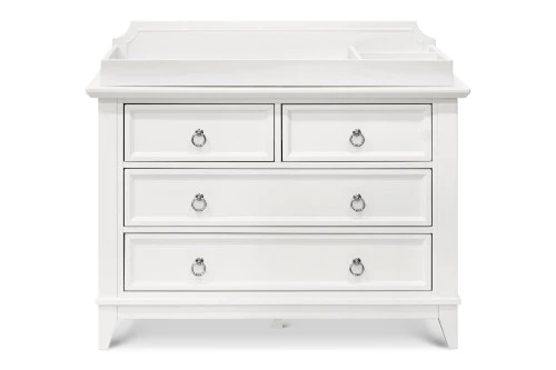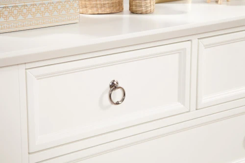 The Emma Regency 4-Drawer Dresser is an elegant storage piece with four spacious drawer options for organizing baby’s necessities. Sleek tapered feet, timeless front and side panel molding, and contrasting ring drawer pulls add a gilded touch to this classic dresser. Each drawer features dovetail construction with full-extension and ball-bearing drawer glides.