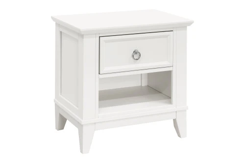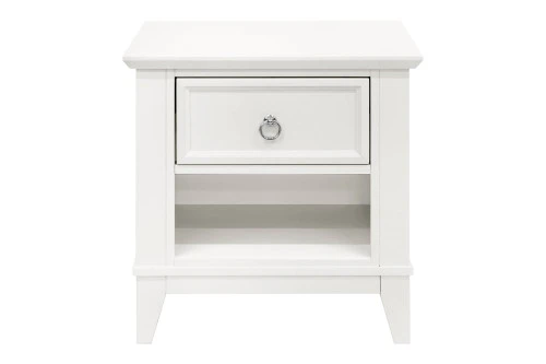 The Emma Regency Nightstand offers one spacious dovetail drawer and one open shelf to display your favorite books within the home. With its sleek tapered feet, timeless front and side panel molding, and contrasting ring drawer pull, the Emma Regency Nightstand is the perfect accent storage solution that blends with any classic styling. Drawer features dovetail construction with full-extension and ball-bearing drawer glides.