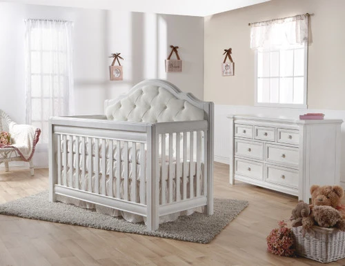 The Pali Cristallo 2 Piece Nursery Set w/ Beige Fabric Panel includes the Pali Cristallo Forever Crib w/ Beige fabric and the Cristallo double dresser in a stunning Vintage White finish.