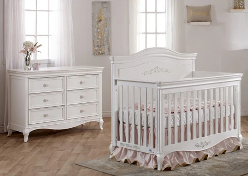 The Diamante 2 Piece Nursery Set includes the Diamante convertible crib with Decor panel and the Diamante double dresser in Vintage White.