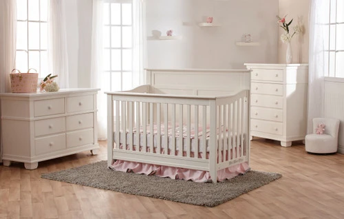 The Napoli Flat 3 Piece Nursery Set includes the Napoli Flat top convertible crib, the Torino double dresser and Torino 5 drawer chest.